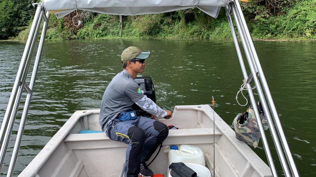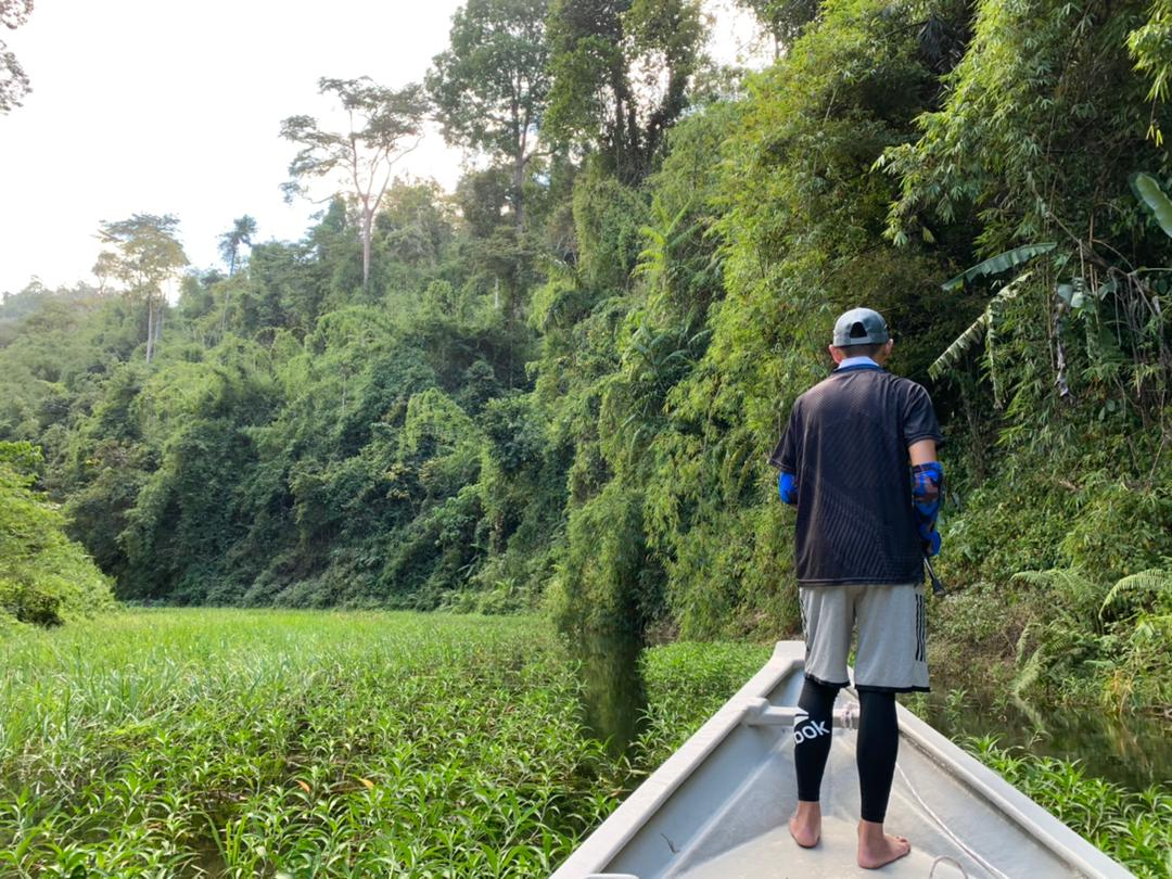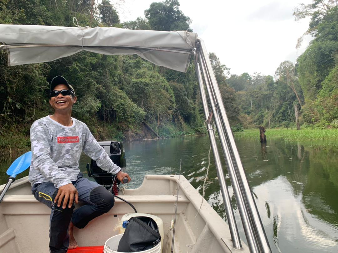 Abang Fad, in his natural element educating us about the tribes while we were trolling for “Sebarau” or Hampala Barb.